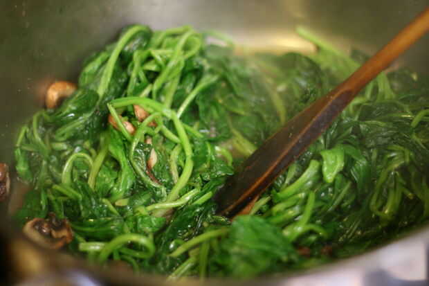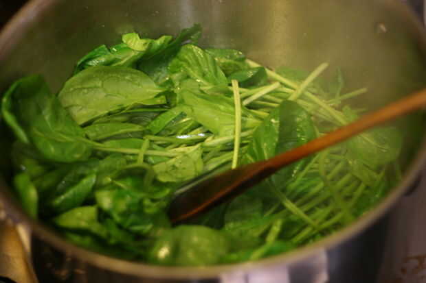 Cuando están cocidas las setas, añadir las espinacas1 en puñados. Remover y como la espinaca se marchite agregar más. Cuando la espinaca esté cocida, retirar la olla del fuego y continúe con el siguiente paso.