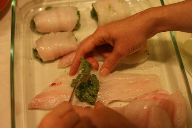 DAB una cucharada de espinacas relleno de aproximadamente 1/3 del camino a lo largo de sus filetes y comenzar a rodar alrededor de la espinaca del extremo corto. No importa si se trata de la cabeza o extremo de la cola - experimentar con ambos a ver si tienes una preferencia. No noté una diferencia.