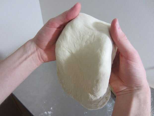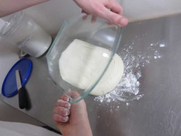 Después de que la masa ha aumentado de 60 a 90 minutos, resultan en una superficie ligeramente enharinada. Formar una bola y dividir aún más, si es necesario. (Tenemos nuestra dividida en dos partes más, para hacer dos pizzas personales). NO amasar en este punto.