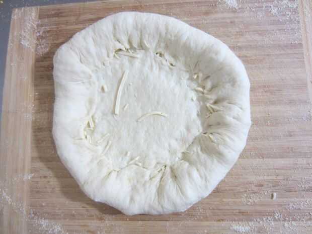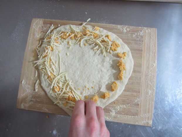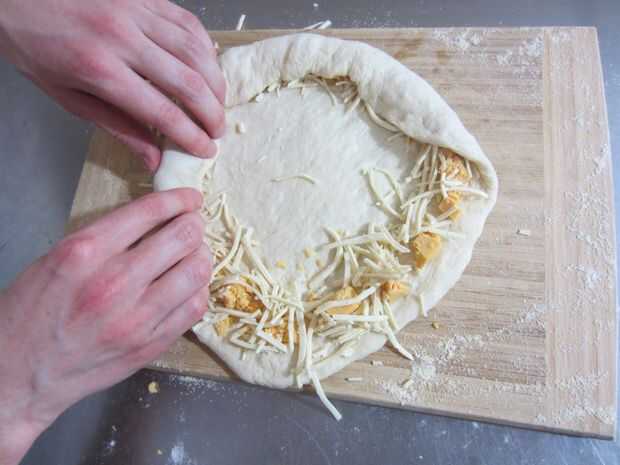 A continuación, doblar el borde sobre el queso y apriete hacia abajo para sellarlo.