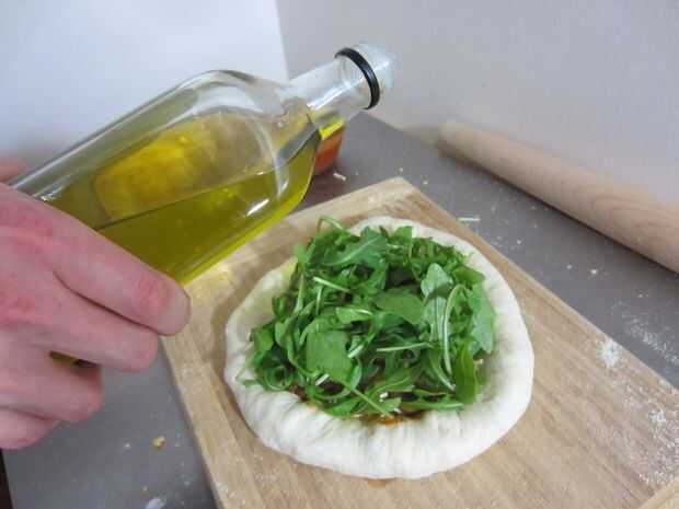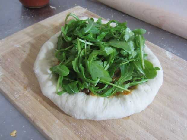 Luego agregar cualquier otros toppings que más te gusta! Utiliza champiñones salteados, aceitunas verdes y rúcula, luego terminar con un chorrito de aceite de oliva.