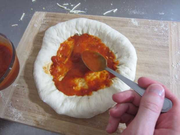 Cubrir la masa con la salsa de tomate favorita y añadir un poco de queso en cualquier cantidad que desee.