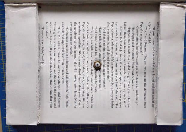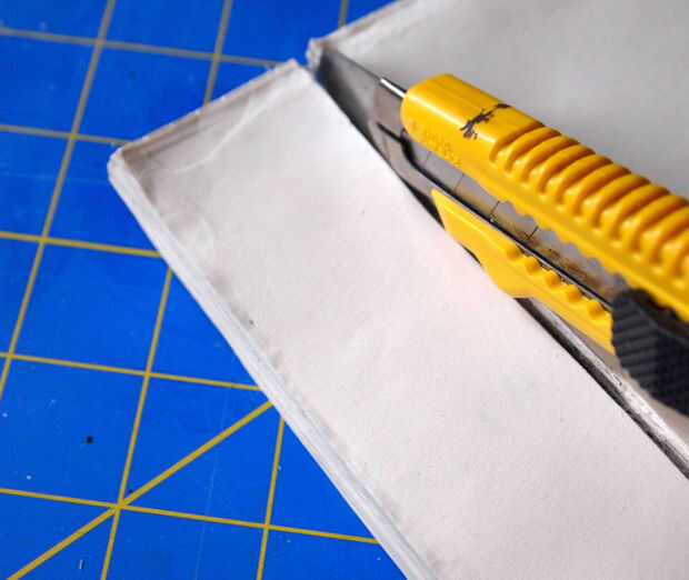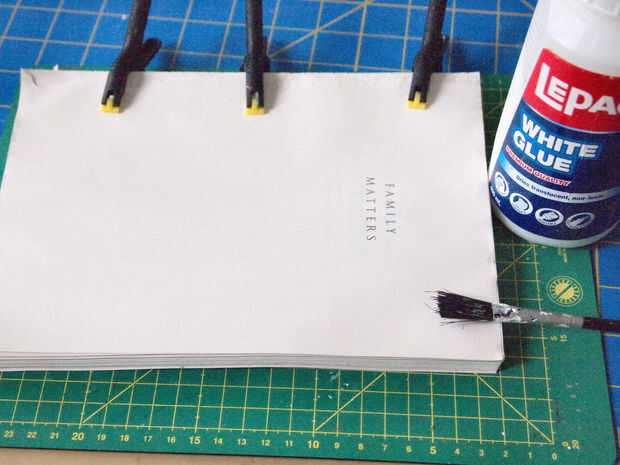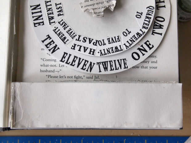 Aunque ahora tenemos espacio para el eje del mecanismo del reloj después de sacar de las páginas, hay una gran brecha y la tapa frontal descansa en el eje del mecanismo del reloj. Para solucionarlo, pegan las páginas que se sacó (pegamento en los bordes - para mantenerlos juntos), luego corte ~1-1.5 pulgadas piezas para caber a lo largo de la parte superior e inferior del libro para usar como separadores. Asegúrese de que hay suficiente espacio para que la manecilla en el centro. Pegar las piezas y usar una abrazadera para sujetar en su lugar mientras se seca el pegamento. Ahora la tapa frontal descansa sobre los espaciadores y no el mecanismo del reloj.