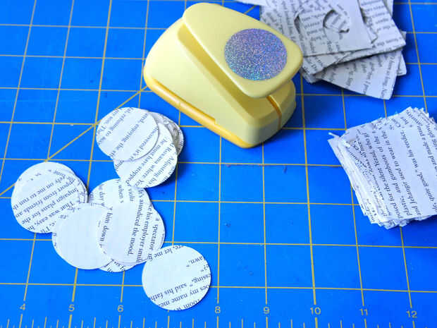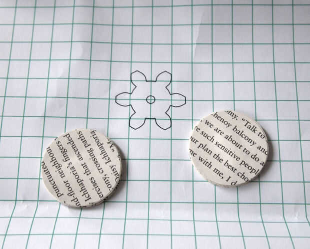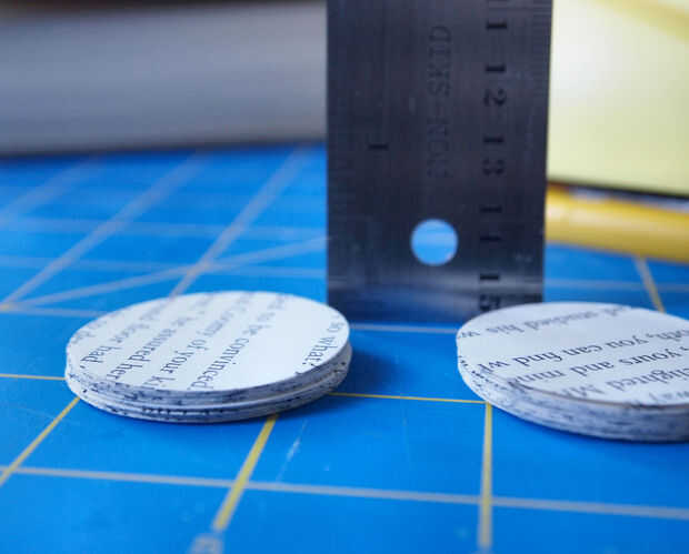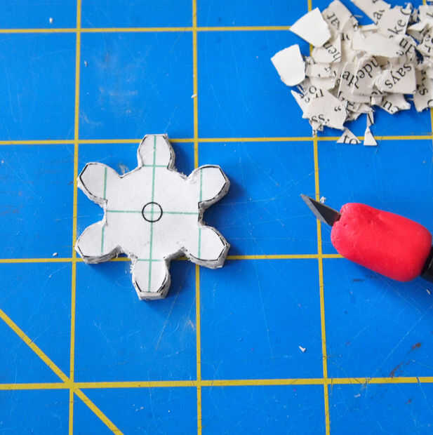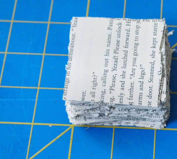 Los engranajes se hacen de las plazas repuestas de páginas del libro izquierda cuando se hizo el agujero del mecanismo del reloj. Desde esas páginas corte unas cincuenta círculos de diámetro 1.5 pulgadas, afortunadamente tuve un golpe que facilita esta tarea (ahora si sólo se podía conseguir un engranaje en forma de puñetazo). Me divide los círculos en dos montones de 25 y pegar las páginas en cada montón juntos en una pila con un palillo de pegamento. Entonces yo cortar la forma del engranaje usando un cuchillo.
