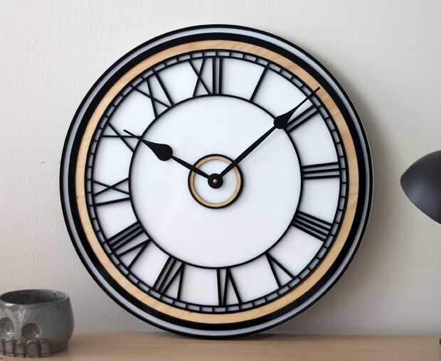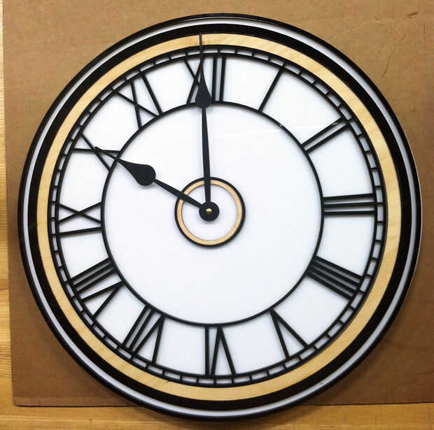 Corté un círculo blanco grande de acrílico para hacer la base, con un agujero en el centro para el mecanismo del reloj. Luego corté círculos de acrílico negro y madera para fabricar los anillos.