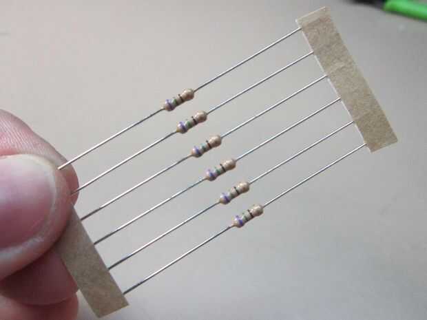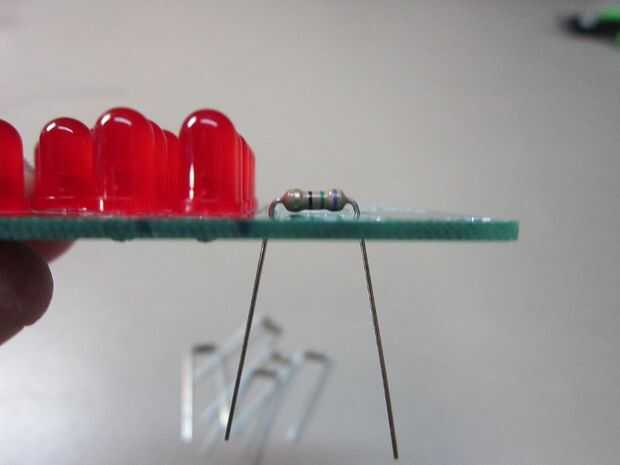 Hay seis resistores en el kit.  Simplemente doblar los cables en el extremo e insertarlos en las cajas de R en el tablero.  No son polarizadas y puede ir de cualquier manera.  La soldadura y los cables extras al igual que los LEDs de clip.