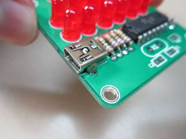 El conector USB debe encajar cómodamente en el tablero.  Las lengüetas de metal en la parte frontal y derecha del tablero para una buena conexión mecánica de la soldadura.  Sólo necesita las dos clavijas de datos exteriores para tierra y corriente de soldadura.  Las fotos ilustran lo debe parecerse.