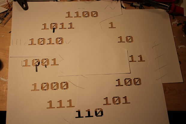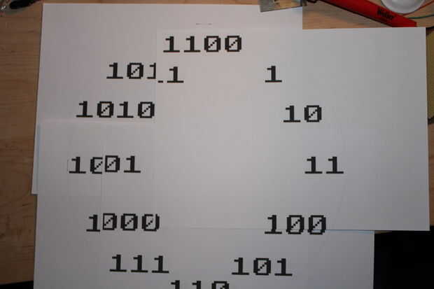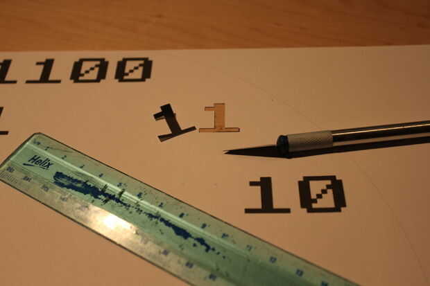 Puede ser más fácil para cortar a un '1' stencil y un '0' de la plantilla y sólo tiene que utilizarlos, pero quería asegurarse de que tengo más o menos exacta las distancias.