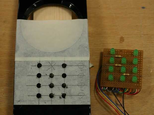 Para montar los LEDs en el altavoz esclavo yo en primer lugar enmascarado el frente con cinta después marcaron los 11 hoyos. Porque he usado protoboard el espacio es agradable e incluso con cada columna 0.5" aparte y 0,4" entre LEDs de cada columna. Tenga cuidado de no dejarse llevar y perforar hacia fuera la parte superior mediano LED, como allí no es un LED en posición!