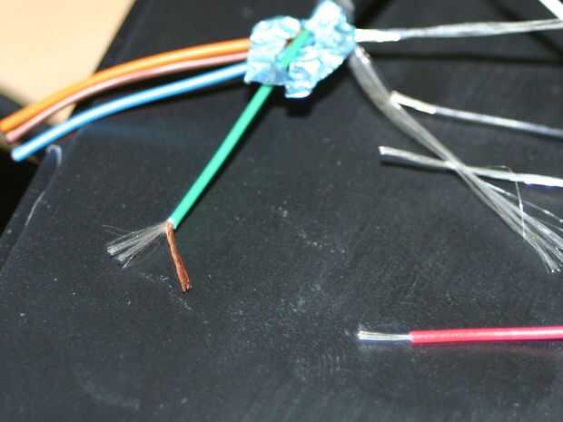 Entonces tuve un momento de bombilla y realizado podría utilizar un viejo cable de teclado USB y vuelva a colocar el cable de 2 hilos. Esto significó un poquito más de trabajo pero creo que valió la pena. ¿Una cosa a señalar es que usted no debe usar un cable de ratón como dentro de cada núcleo de los cables de 4 fibras de plástico? Por lo que es un poco más difícil trabajar con. El cable del teclado es ligeramente más grande en diámetro pero los núcleos no tienen fibras en ellos y un diámetro más grande. Se pueden ver en las fotos las 4 conexiones que hice en cada extremo. En una foto se puede ver la diferencia en el cable del ratón y el teclado cable, el cable verde es el cable de ratón y tiene filamentos de plástico en cada base, el cable rojo es del teclado y es de cobre estañado.