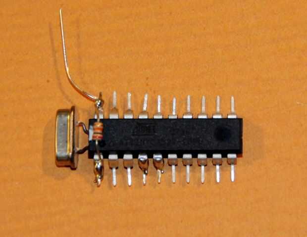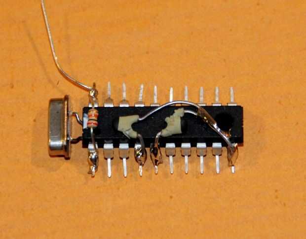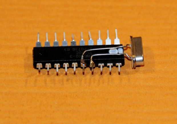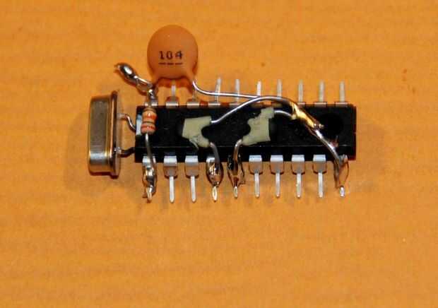 El cristal al pin 4 y 5 en el chip de la soldadura. Corrí las puntas del cristal en la parte inferior del chip para sacarlos de mi camino.
