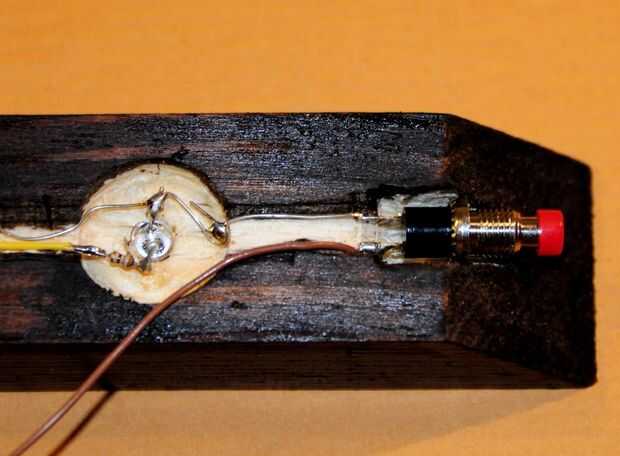 Cincel hacia fuera una sangría para el botón en la madera y conecte el botón que se conectan a los leds. Luego alambre de la soldadura otro tiempo suficiente para llegar al microcontrolador con el otro conector del botón de