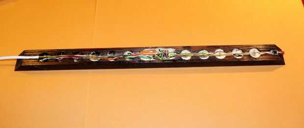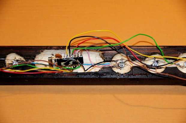 Terminar con soldar los cables de alimentación para clavija 20 (plus) y la clavija 10 (menos) de la CPU. Y sí, hay un cable final al do - suelde un cable entre el pin 10 en el microcontrolador con el cable largo conectar todos los leds (y el botón).