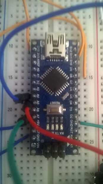 Así que coloque en el NANO en el tablero. Haga las conexiones de VCC y tierra a los bancos de energía en el tablero de pan.