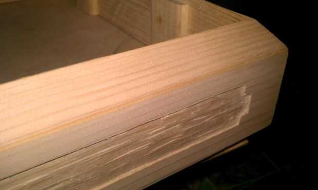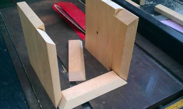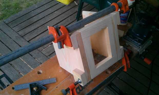 Otra vez no es demasiado difícil, pero tal vez amarillo pino no es la mejor opción aquí. Quería tener todo claro, pero los cortes requeridos para la cubierta interna son muy drásticos y una madera más dura habría manejado mejor. Pero, soy barato y usado todos mis restos de arce en las columnas y no tenía ganas de ir a la yarda de la madera. Con lo que tienen y falso el resto. Los lados eran dos piezas pegan al lado arriba y abajo son la madera contrachapada de 1/4" de la caja de arquitrabe y fondo, así que lo único que realmente necesito son decorativo superior e inferior de la esfera del reloj y un respaldo. Quería una puerta de acceso en la parte trasera, así que me decidí a hacer la pieza posterior muy simple con dos montantes y dos carriles. Con un cincel corte un canal de 1/4" en uno de los largueros para un tope de puerta. Las caras frontales nuevo inglete y chaflanadas también con un ángulo de 30 grados. Finalmente usando la tabla vio que cortar una ranura a través de las piezas de cara a aceptar la pieza frontal de latón. Todo lo consigue pegados juntos excepto la pieza de la cara superior. Esto mantenemos clara hasta que el reloj se coloca. La carcasa interior obtiene pegada y clavada a the1/4 "tablero de madera contrachapada que se apoya en los bloques de soporte de caja de fondo.