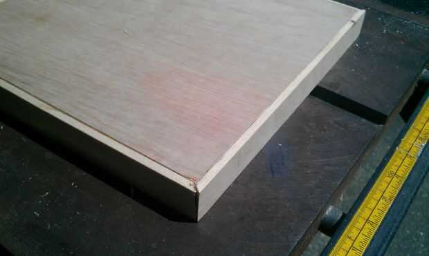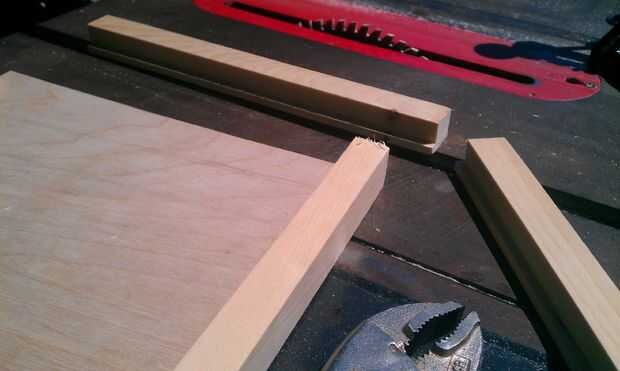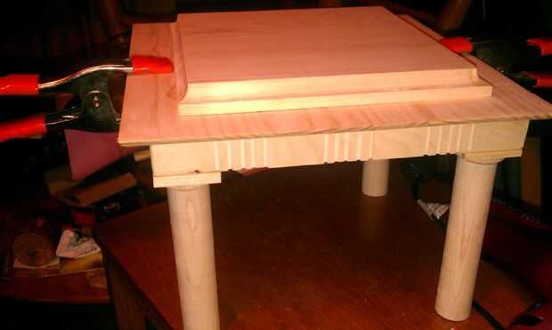 Este fue construido con las esquinas a inglete y un fondo flotante celebró con un surco. Los lados fueron chaflanados en un ángulo de 45 grados. Pequeños bloques de madera estaban pegados en el interior de la caja para formar un borde que sería en la parte superior del reloj. Dos de los lados de la caja se perforaron para aceptar la toma de corriente y los botones de ajuste. Por último, la parte frontal de la caja se cortó con una decoración poco profunda para finalmente aceptar un pedazo de latón decorativo.
