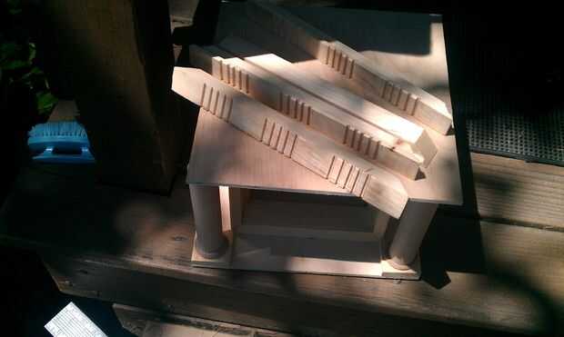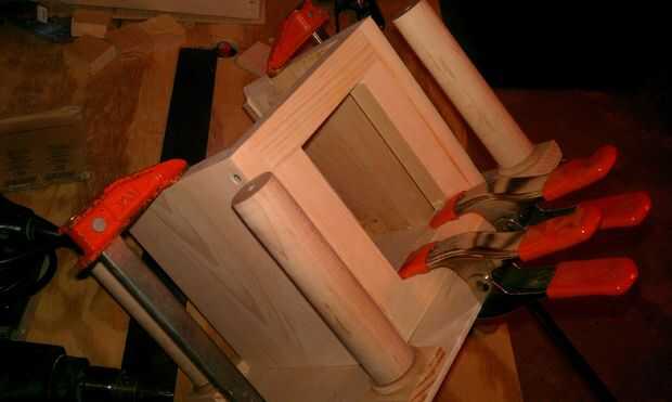 Probablemente el más difícil y lo más divertido de esta compilación. Las columnas eran mano vuelta en un mini torno a cerca de 1" diámetro. La parte que lamento más no tener una foto de la ronda de encabezados y pies de página. Ésos fueron hechos otra vez girando un taco, esta vez cerca de 1 1/2" diámetro. Marcado hacia fuera de la anchura de las piezas y separados por el ancho de mi sierra de picar 1/8". La espiga luego fue cortada en más o menos esta forma: