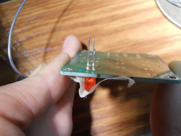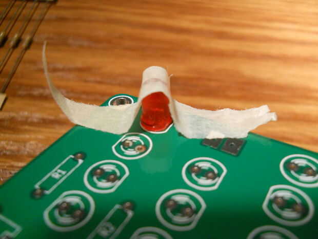 Este es el punto focal del proyecto, por lo que queremos que se vea bien. Una vez que el LED se coloca en el tablero, te recomiendo un pequeño trozo de cinta adhesiva para mantenerlo en la Junta mientras que está siendo soldada en su lugar. Si nada es sujeta LEDs en su lugar, puede soldar en su lugar a ángulos de indeseados.