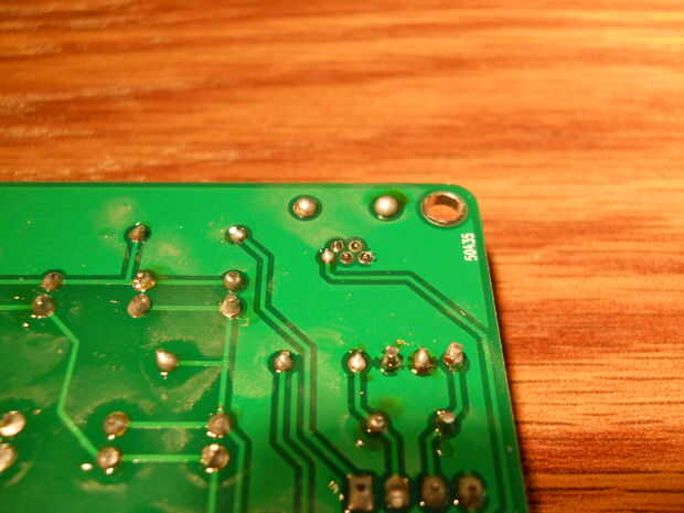 La conexión importante a hacer es la parte inferior izquierda y derecha, con el tablero orientado como se muestra a continuación. Además de estos puntos, los dos puntos de montaje que la sujetan a la necesidad del tablero terminado. A continuación, tengo el punto extremo izquierdo terminó, esto es la conexión de 5v positivos. Además, la extrema derecha perno necesidades estén soldadas en su lugar, para el circuito de tierra.