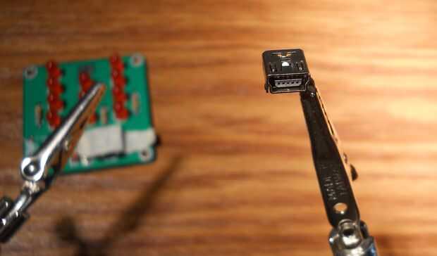 Conectando los puntos se van a asegurar el puerto mejor y mantenerlo más seguro a largo plazo... todos los pernos están muy cercanos y pueden ser difíciles mantener separada la soldadura. Asegúrese de que estos puntos de soldadura no toque. Conectando estos puntos entre sí puede dañar los equipos. Los pines corresponden a energía, tierra y datos de las transferencias.