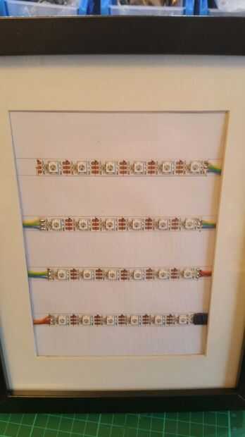 La final fue imprimir sobre acetato, recortado y puesto tras el cristal, la foto a continuación, montar y luego tiras del LED, finalmente eso tablero del forro con los cables que sale de la alimentación y de datos.