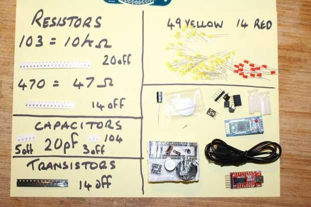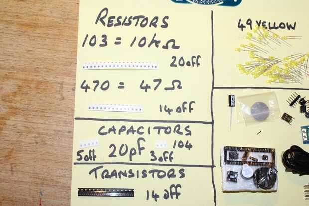 Antes de precipitarse en esta compilación un poco de tiempo para trabajar en lo que va donde y descargar la lista de componentes. En uno de los cuadros que verás que he puesto todos los artículos hacia fuera en un pedazo de papel, esto no fue sólo para el instructable pero ayuda a identificar los componentes. Usted debe ser capaz de ver en las fotos que hay dos valores diferentes de resistencias y los valores reales (47 ohmios y 10000 ohmios) son muy diferentes, por lo que es muy de importación de la lista de componentes y asegúrese de que obtener los valores correctos en el lugar correcto. También cada transistor posee dos resistencias diferentes, por lo que los valores tienden para alternar a lo largo de la placa. Intente colocar las resistencias y la soldadura con los números hacia arriba, entonces si tienes un problema, puede comprobar los valores.