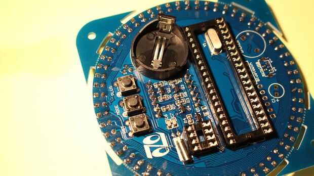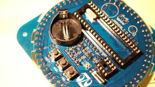 Paso 5) soldadura de los tres botones, dos titulares de chip y soporte de la batería. no hay mucho que decir acerca de estos componentes aparte debe soldar cada un pata componente primero y verificar la alineación antes de soldar el resto. Los botones sólo pueden seguir sola su camino y los titulares de dos chip tienen una muesca en el extremo que debe estar alineado con el gráfico de la PCB, nota los dos chips de distintas formas de cara! antes de soldar la batería titular de la curva sobre la pierna que va a terminar debajo de la pantalla, otra cosa tienes que cortar hacia abajo.