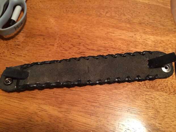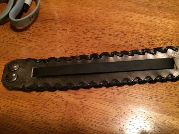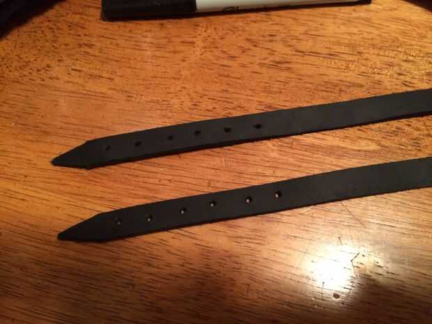 Usted necesitará 2 correas para sujetar la cabeza del reloj (yo usé 2 a 8 3/4"). Recorte los extremos y añadir los agujeros de perno de hebilla a estas 2 tiras.