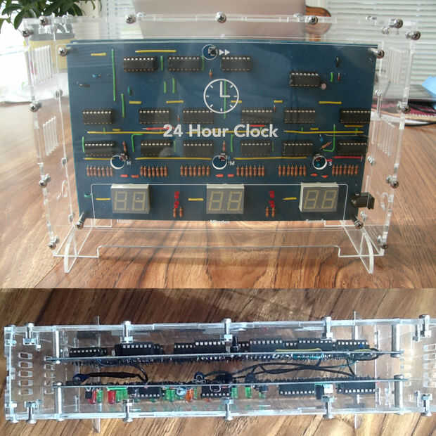 Arte de PCB está incluido en este instructable así que usted puede hacer fácilmente!Un reloj de 24 horas basado en basado en contadores de década dual, puertas y portones, BCD a Decimal convertidores y un oscilador de cristal. No los reguladores micr