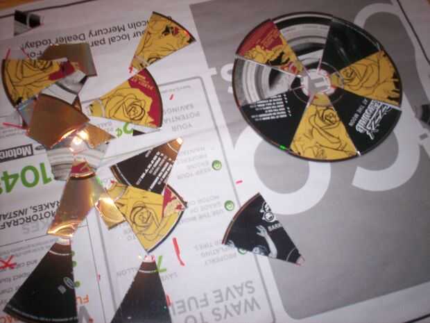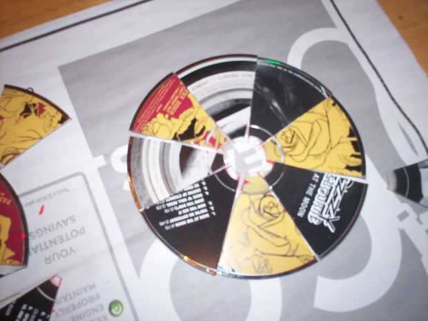 Usando las tijeras, corte cuidadosamente a lo largo de sus líneas. Digo con cuidado porque rompí varios cds en este procceedure. Después de cortar tomar algunos pedazos de cada cd y tratar de encajarlas en un nuevo cd como se ve en la foto.