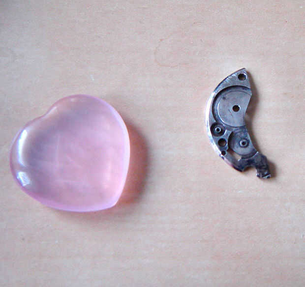 tenía una pequeña placa desde el interior de un reloj que encaja muy bien en toda la cara del corazón de cuarzo.  He aplicado algunas pintura negra y limpiar con un paño antes de secar para darle un aspecto envejecido / smokey.