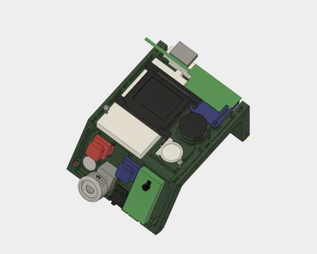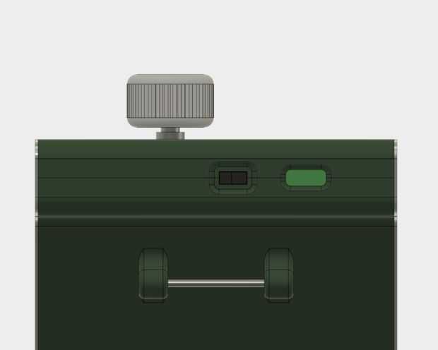 Elegí para el diseño de la interfaz en dos pulsadores momentáneos y un codificador rotativo (con interruptor incorporado) y una sola diapositiva SPDT switch. El interruptor controla directamente la energía de la batería de LiPo. Aunque podría haber fácilmente diseñé alrededor de sólo el codificador para la interfaz de usuario, desplazamiento y confirmar para cada interacción solo toman tiempo y pueden llegar a ser tedioso, además quería tener los botones rojos y azules a la de los comunicadores del estilo de Venture Bros.