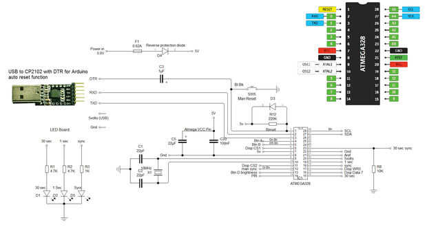 El circuito es un DIY Arduino Uno con un CP2102 (con DTR para auto reset) para permitir la programación. Usted puede comprar kits de Ebay con el Atmega 328 I / C, cristal de cuarzo y capacitores incluyen. Conseguir pre programado con el gestor de arranque Uno a menos que quiera programar su propio.