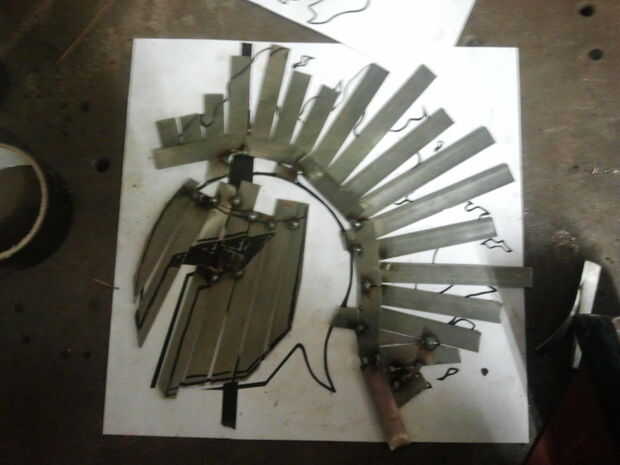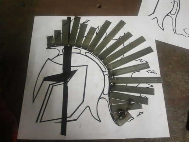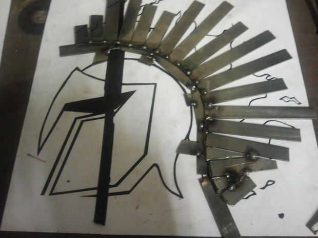Para lucir bien, arregló las tiras de tal manera que clase de alineados con la parte específica de la insignia. En este momento todo se hizo más o menos a la forma correcta. Más tarde agregué varias pequeñas tiras para reforzar o para mejor. Todas las tiras, de una parte de la insignia, fueron 'spot' soldadas con autógena juntas.