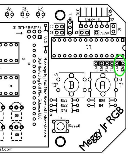 Junta de Meggy Jr pone a disposición a través de las cabeceras PC4 y PC5, resaltado en la imagen de abajo SDA y SCL.