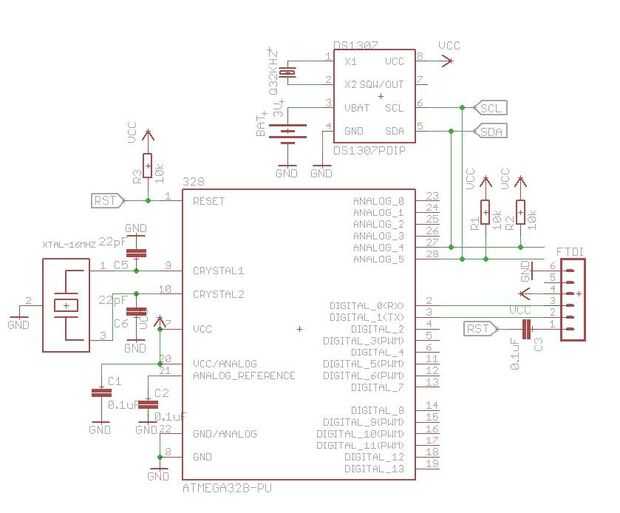 DS1307 tiene un conjunto de éstos (pines 5 y 6, respectivamente), como tiene ATmega328 (pernos 27 y 28, respectivamente). Necesitamos conectar estos pines como se muestra en el esquema adjunto.