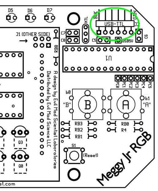 Para alimentar el chip DS1307 necesitaremos también la línea de 5V (Vcc) y masa (GND). Ya que no queremos soldar los cables a la Junta de Meggy Jr, nos llevará de alguna manera desde el conector FTDI, que se muestra resaltado en la última imagen.