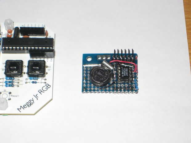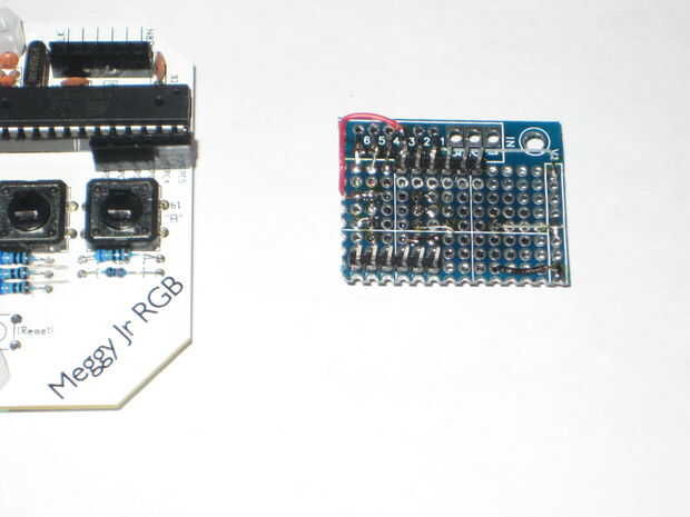 El Consejo generalmente al soldar cabeceras masculinas es que enchufado. Coloque la placa de prototipado pequeño, corte para caber entre el borde de la tabla y la matriz de LED, en la parte superior los encabezados de hombres y de la soldadura en su lugar, pin por pin.