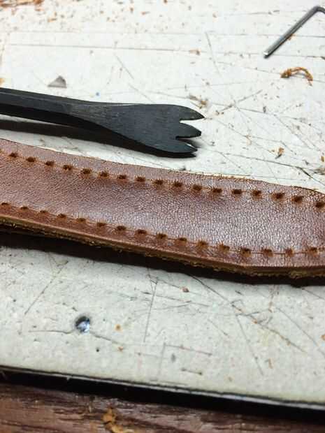 Aquí es donde vienen los cinceles. Primero usé mi Cincel plano unido a un artilugio de casquillo de la pluma para hacer una ranura en el borde. Poner la tapa de la pluma en el borde del cuero y ejecute el cincel a lo largo de la piel. Entonces, en el surco, empezar a marcar agujeros con el Cincel puntiagudo o tenedor. Para mantenerlo como incluso posible, puse los dos primeros puntos en el cincel en los dos últimos puntos que hice. cuando llego a la curva sólo mantengo el primer punto de cincel en el último punto.