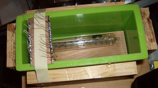 Para unir correctamente los cables a la que tenemos que descansar el tubo en el molde en su orientación correcta. Esto requiere colocar temporalmente un bloque de madera en la parte inferior del molde para apoyar el tubo en su posición vertical.