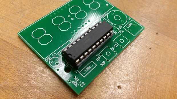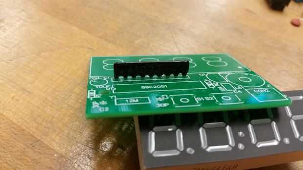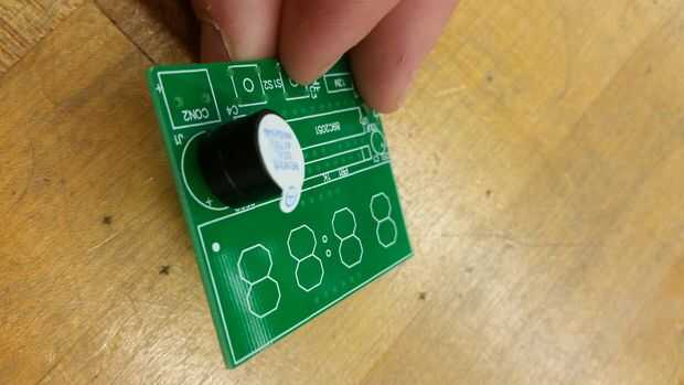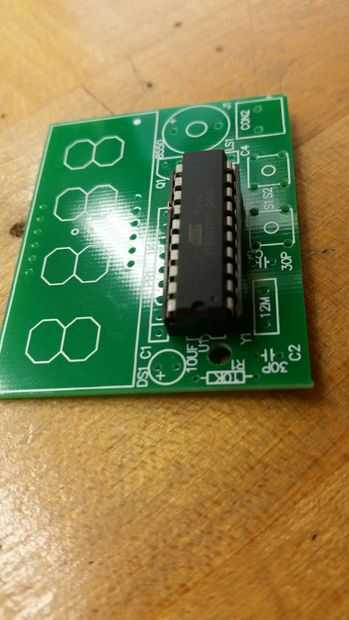 La polaridad y la orientación de los componentes más grandes deben ser la correctas o bien el reloj no funciona. Empecé con el zumbador piezo; el lado positivo está marcado en el papel de cubierta blanca y usted debe emparejar para arriba con el + marcado en la placa. Siguiente que soldar en el conector de entrada de energía. Los lados abiertos de la toma de corriente deben estar lejos de la PCB. A continuación el IC (circuito integrado) debe sentarse en su zócalo; no importa la orientación. La IC tiene una muesca semicircular pequeña en un lado; coincidir con esa muesca con el que está en la PCB. A continuación el controlador de pantalla LED necesita ser alineados correctamente. El punto blanco etiquetas Pin #1, que debe coincidir con el cuadrado blanco en el PCB para el pin #1. A continuación la pantalla LED que frente a la manera correcta. Asegúrese de que tener los puntos de la pantalla de LED en el centro de la placa. Por último, los botones momentáneos no necesitan alguna orientación específica.
