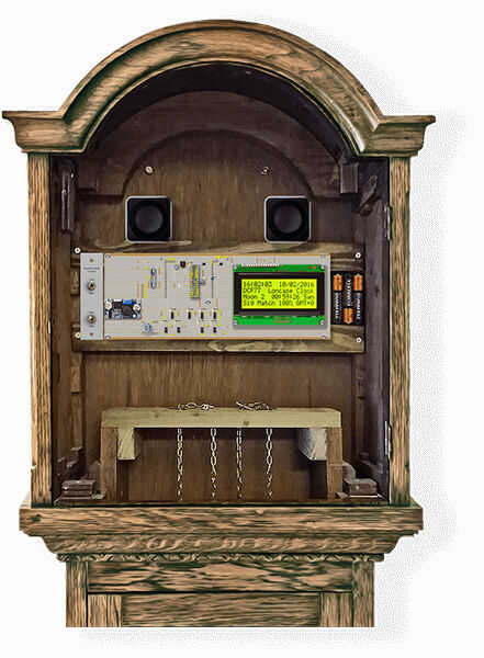 Este reloj tiene 3 diales analógicos, horas/minutos, segundos y, también, una esfera de fase lunar. Hay una pantalla de LCD 4 x 20 secundaria debajo de la campana para dar información completa sobre el estado de los relojes. Los controles de reloj montados sobre la misma vero como la pantalla LCD.