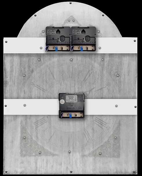 La barra de montaje para los segundos y la luna se encuentra detrás de la placa de dial para mantener dos segundos y la luna las manos cerca de los anillos de capítulo. La placa de dial se muestra semi transparente para mostrar ubicaciones de capítulo anillos y enjutas en la parte delantera de la placa de dial.