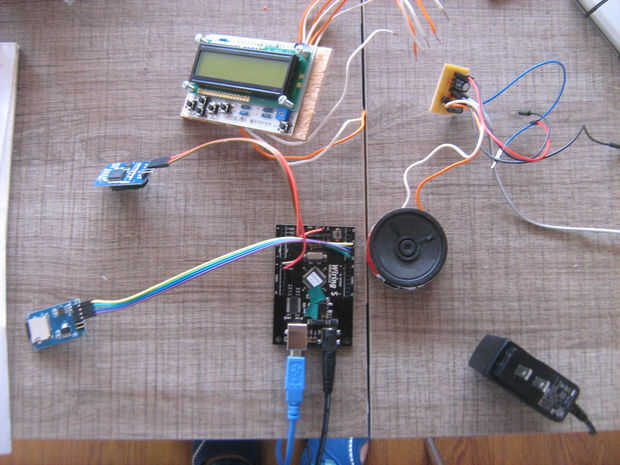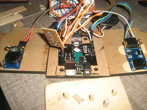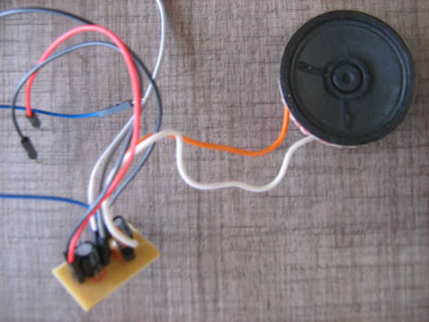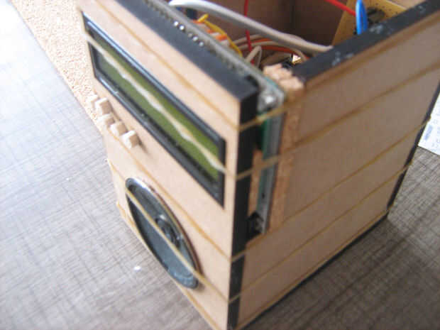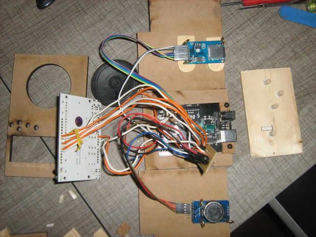 Utilizamos algunos tornillos para fijar los componentes electrónicos a los lados de la caja y madera pegamento para pegar los lados de la caja. El altavoz se fijó con silicona fría.