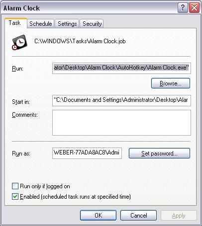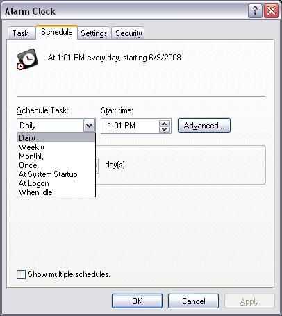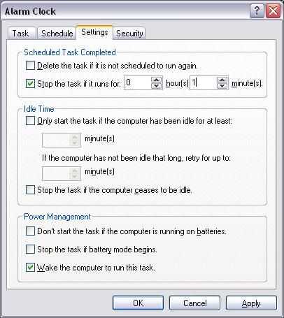 El siguiente paso te pide un usuario y contraseña, no te preocupes acerca de esto y simplemente haga clic en siguiente. El último paso le pregunta si desea abrir la configuración avanzada para la tarea. Usted querrá asegurarse de que esta casilla de verificación y haga clic en finalizar. Saltará un error sobre derechos insuficientes que desea ignorar y haga clic en Aceptar para continuar. Aparecerá un nuevo cuadro con algunas opciones que puedes jugar alrededor con. El primero que desea definir es el plazo sólo si ha iniciado sesión en la opción para asegurarse de que el programa se ejecutará aunque no tiene su contraseña de windows. La página siguiente es el calendario y se puede cambiar la configuración de cuando va aquí. La última página que usted tendrá que preocuparse es la página de configuración. Tienes que configurar la tarea de detener si se ejecuta durante más de 1 minuto. No esto no dejará de vlc de jugar, pero se detiene tecla auto si se queda colgado. También tendrá que asegurarse de que las tres últimas casillas configuradas correctamente para que el equipo jugará la alarma pase lo que pase. Asegúrese de que los dos primeros de los tres últimos cuadros son y el comprobar como en la foto.