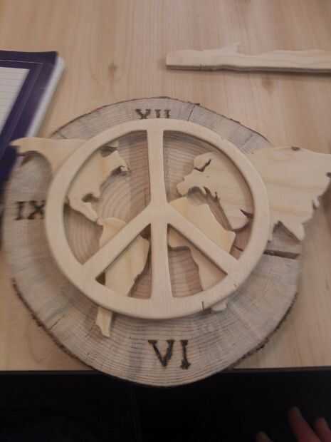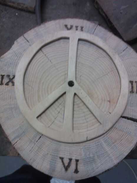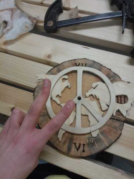 Pegué el símbolo de la paz y lo mantuve unos 30 minutos. Utilicé la madera de prueba para evitar daños en la madera principal con los "apretadores". (resultó muy útil esta madera de prueba = D)