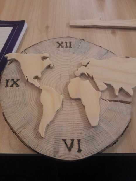 El agujero ya está hecho, sólo queda organizador la forma del mundo y pegarlo con pegamento. Probando algunas posiciones de los continentes, me di cuenta de algo.