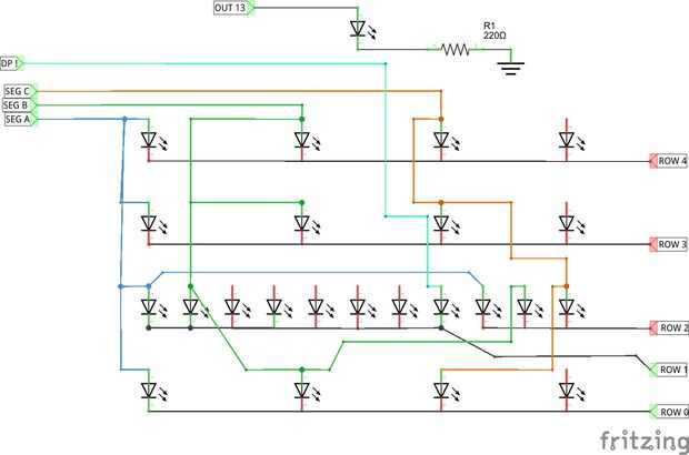 En este esquema, ves cómo los LED están conectados juntos. Sólo saqué los tres primeros, los demás van igual.