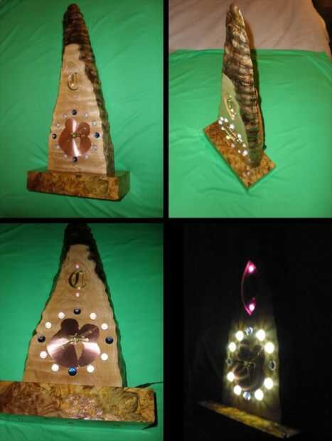 The2 principales piezas de madera se adquirieron en E-bay después de mucho buscar. Esos serían el pedazo de reloj principal de arce rizado con los bordes de la corteza natural y la Base de Burl de Gmelia (de Hawai). La pieza posterior que las luces de las casas es un pedazo de acolchado de arce rizado. Más información en pasos posteriores... El reloj de posiciones y por encima/por debajo de la inicial es todos Crystals de Swarovski. Inicial "C" y el reloj de las manos se cortan de 1/16" de latón macizo. Silueta se redujo de 1/32" de cobre sólido. Base y cubierta de la luz en nuevo son todos los que llevan con los tornillos de latón.