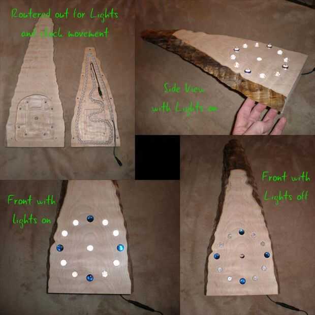 Luego pasó a routering fuera de la cadena ligera asegurándose de dejar alguna zona alrededor del perímetro que se unirá a la parte posterior de la pieza del reloj principal. Tuve que router cerca la el espesor completo de la madera para permitir espacio suficiente para las luces, como al estar de pie estrecho para arriba, estaban un poco más gruesos que inticipated, pero todavía funcionó muy bien!